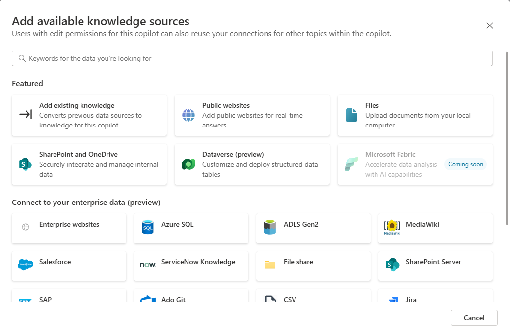 Connectors let your copilot search information outside of the built-in sources (Graph, and the copilot’s default knowledgebase). You can use Graph connectors to add your own custom data into Microsoft Graph, allowing the copilot to access it. That could be incidents from ServiceNow, or some other system. You “push” data into Graph, and update as necessary.