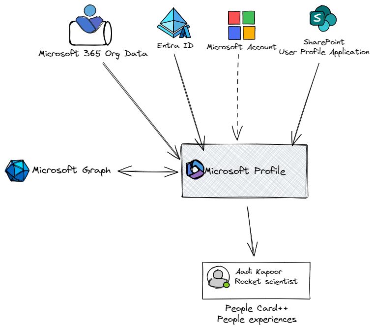 This shows a much flatter architecture. User data flows from many sources (including the SharePoint UPA) flowing into the M365 profile, where it’s then used to sync to Graph as well as exposed via profile cards in the UI. Thank you, Wictor!!